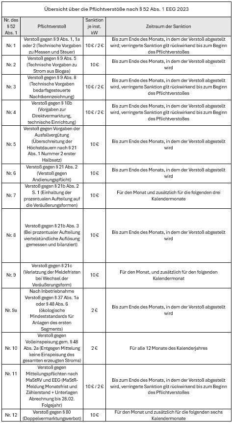 Mit Inkrafttreten des EEG 2023 am 1. Januar 2023 wurde mit der Änderung des § 52 ein neues Sanktionsregime für Pflichtverstoße eingeführt. Damit werden die ausdrücklich aufgeführten Pflichtverstöße nur noch mit Strafzahlungen sanktioniert.
